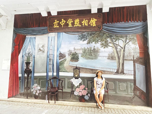 一位市民在汉口中山大道立中堂照相馆3D墙绘前留影