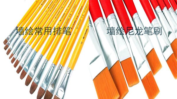 画笔有很多材质,比如尼龙刷,猪毛刷,羊毛刷,狼毛刷,不同的材质,功能和特性都不一样,各有优点和缺点,比如尼龙笔刷弹性比较好,上色和涂刷起来非常平整,缺点也非常明显,容易透底,尼龙材料也不吸附颜料,涂刷过程中颜料容易往下滴洒弄脏地面,同时涂刷几笔就需要蘸颜料,比较费时费力。反之羊毛刷就刚好弥补这个缺陷,所以墙绘初学者一定要多研究,熟练掌握每一种工具的使用技巧。