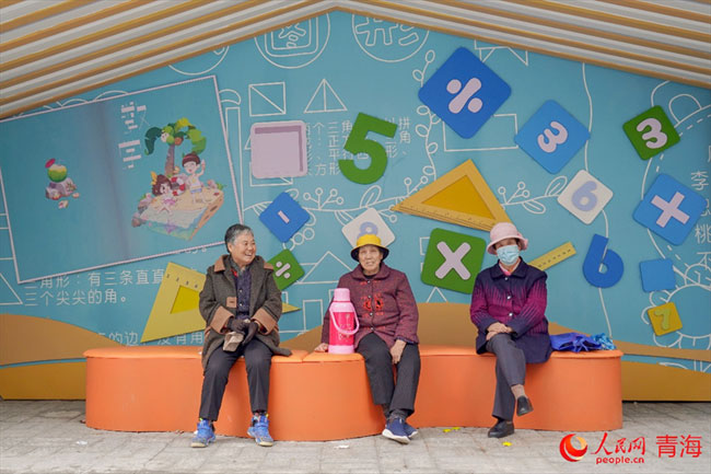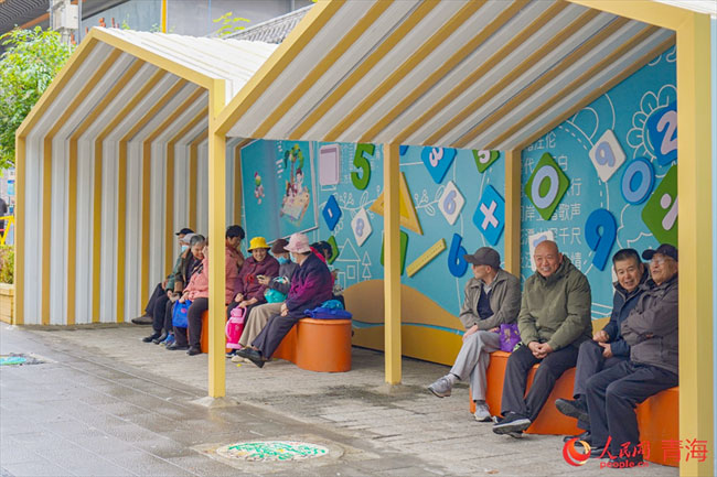 老街居民三五为伴,在彩绘墙下休憩闲谈